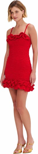 - This mini dress is made of stretch jacquard with a fitted bodice and a ruffled design along the square neckline and hemline. Concealed back zipper closure. Made in Brazil. 97% Polyamide 3% Elastane. VEC31774