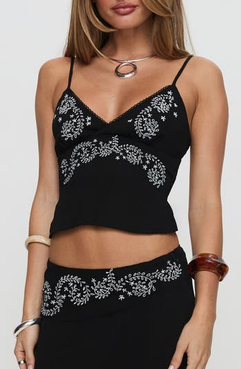 Twirling floral embroidery decorates this cropped camisole designed with a trio of dainty ties bridging the open back.