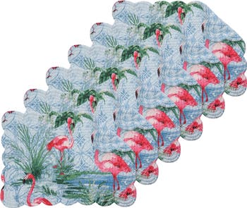 Transform any tabletop into a beach paradise with the coastal-inspired Paradise Coast tabletop collection. It features flamingos in tropical blue and pink hues and a natural feel, making it the perfect choice to bring a relaxing atmosphere to any space. The scallop-edge table linens reverse to a simplistic diamond design in a coordinating blue. Available as a napkin, placemat, round placemat, and runner. Love this pattern? Paradise Coast is also available as a bedding collection.