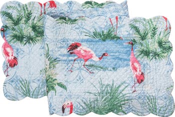 Transform any tabletop into a beach paradise with the coastal-inspired Paradise Coast tabletop collection. It features flamingos in tropical blue and pink hues and a natural feel, making it the perfect choice to bring a relaxing atmosphere to any space. The scallop-edge table linens reverse to a simplistic diamond design in a coordinating blue. Available as a napkin, placemat, round placemat, and runner. Love this pattern? Paradise Coast is also available as a bedding collection.