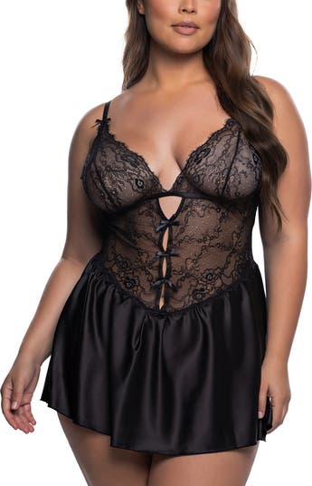 A sheer bodice adds to the sensual vibe of this lacy chemise punctuated with dainty bows and cutouts.