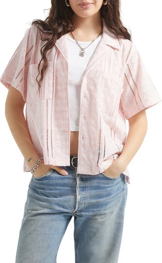 Cut from breezy cotton, this boxy shirt is accented with airy stitching for breathable charm.