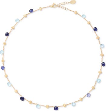 Heart-cut mixed topaz and iolite stones lend organic color to this 18-karat gold chain necklace also stationed with hand-engraved nuggets.