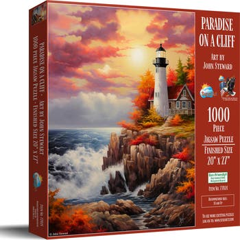 Discover tranquility with "Paradise on the Cliff," a stunning 1000 piece jigsaw puzzle designed by acclaimed artist John Stewart. Crafted with care and precision by SunsOut Puzzles in the USA, this enchanting 20" x 27" landscape transports you to a place of peace and relaxation. with each interlocking piece, allow the serene scene of cliffs and lighthouses to unfold beneath your fingers thanks to precise die-cut techniques. Made from durable recycled cardboard and printed with soy-based inks on high quality recycled board, the puzzle is as eco-friendly as it is enjoyable. Admire the stunning vibrancy of John Stewart's artwork as it comes to life through large color display boxes, turning your leisure activity into a captivating journey through nature's raw beauty. Ideal as a unique, heartwarming gift, "Paradise on the Cliff" is not just a jigsaw puzzle—it's an invitation to experience the joy of artful assembly, the thrill of discovery, and the calm of completion. Embark on this journey today and find the perfect balance between challenge and serenity with SunsOut Puzzles.