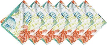 Take a vacation at Paradise Sound with this napkin. A vibrant watercolor design of blue, green and orange undersea creatures gives any kitchen or dining room a touch of tropical life.