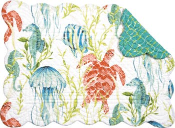 Take a vacation at Paradise Sound with this placemat set. A vibrant watercolor design of blue, green and orange undersea creatures gives the room a touch of tropical life, and reverses to a coordinating net pattern that is perfect for lounging on a summer evening.