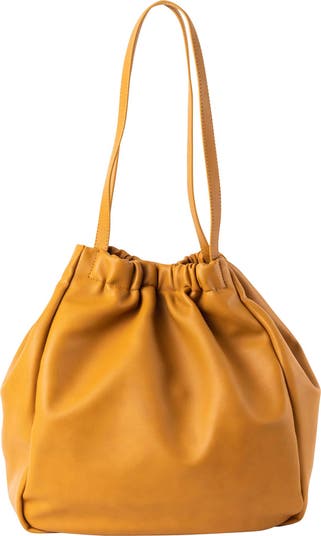 An elasticized topline and optional bridge-clip closure ensure that your items are secure in a slouchy shoulder bag shaped from vegan leather and suspended from elongated straps.