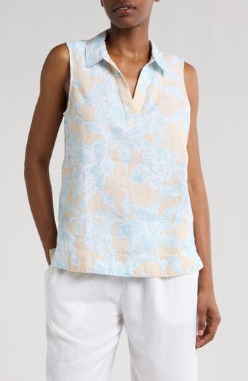 Lightweight linen lends airy ease to a vacation-ready top designed in a subdued tropical-floral print with a sporty johnny collar.