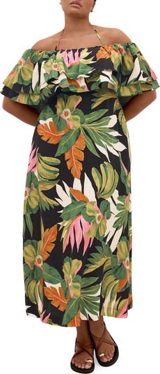 A vivid tropical print enhances the vacation vibes of this breezy linen-kissed maxi romanced by fluttering frills and topped with slender neck ties.