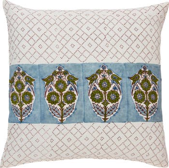Whimsical Parakeets Block Printed Border in the center of pillow.