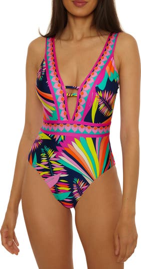 Stroll beachside or lounge by the pool in this tropical printed one-piece swimsuit boasting a laddered plunge neck and strappy open back.