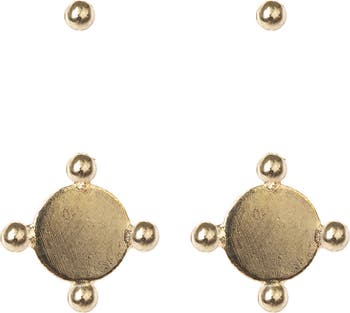 Our Pari Dot Disc Earring Set offers two effortlessly chic styles in one. This 2-pack includes a pair of classic 3mm gold ball studs and a pair of post earrings featuring a polished circular disc framed with ball accents. Handcrafted by artisans in India, these versatile earrings are perfect for mixing, matching, or layering to create your own look. Lightweight and timeless, they add just the right touch of shine to both casual and dressed-up outfits.