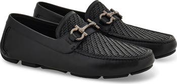 Signature double-Gancio hardware tops an Italian driving shoe partially woven from supple calfskin leather.