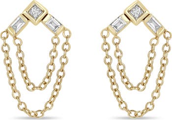 Layered chains drape just below your lobes in these 14-karat-gold earrings topped with princess and baguette-cut diamonds.