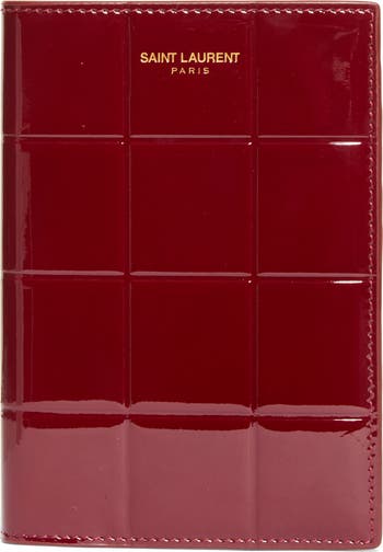 This glossy patent leather passport case is textured with a beveled grid on the exterior and equipped with five card slots on the interior.