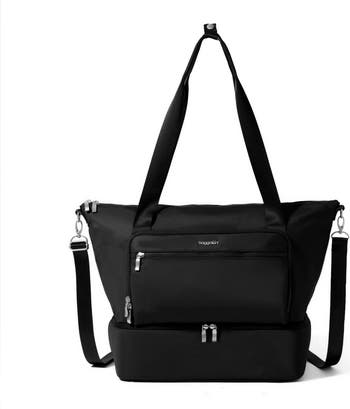 From the gym sessions to weekend getaways, this multi compartment tote bag comes complete with a separate bottom section perfect for packing away shoes or dirty clothes. An RFID-protected passport pocket and luggage handle sleeve ensure this tote is just as useful as a travel bag, too. And with an adjustable crossbody strap, you can easily customize your fit. Exterior dimensions: 15"w at bottom, 20" w at top x 14"h x 7.75"d, 2 lb. 4.8 oz. Capacity: 20 L.
