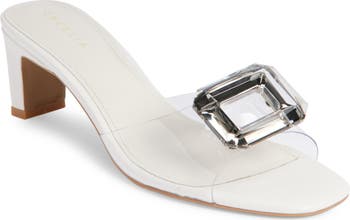 An emerald-cut translucent buckle tops the transparent strap of this sleek, elegant sandal set on a diminutive demiblock heel.