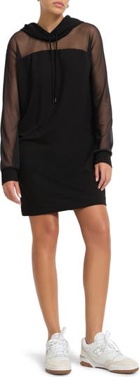 Sheer sleeves play up the contemporary attitude of this hooded sweatshirt dress.