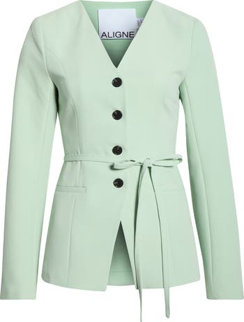 Freshen up lots of looks with a clean-lined jacket cinched with a slim sash and offered in a minty shade.