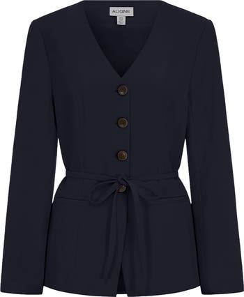 A slim sash cinches the waist of a clean-lined jacket served in a collarless style with simply slit cuffs.