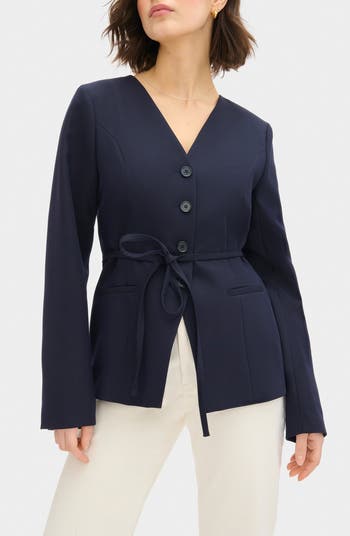 A slim sash cinches the waist of a clean-lined jacket served in a collarless style with simply slit cuffs.