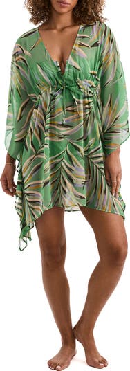 Move from beach to cocktails in this airy chiffon cover-up cut in a leggy length and covered in a leafy vacation-perfect print.