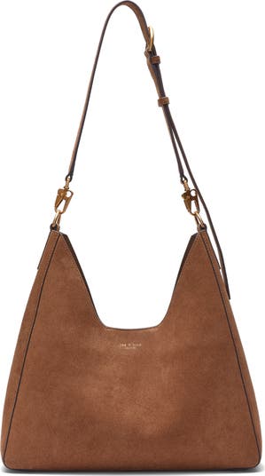 Clean lines and a slouchy topline define a supple suede hobo designed with a roomy interior and removable zip pouch for easy organization. An optional shoulder strap adjusts for comfortable wear.