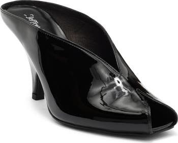A wrapped vamp and an integrated heel bring sculptural flair to this peep-toe mule made from shiny patent leather.