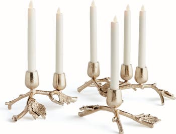 Made from hand-sculpted molds in solid cast aluminum, these nature-inspired branch and leaves taper holders in champagne gold are a substantial accent. Paired with any style taper candles, they make a stunning centerpiece.