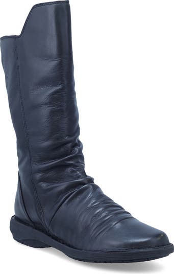 A ruched vamp and angled topline lend textural intrigue to a burnished leather boot set on a cushioned footbed for long-lasting comfort.