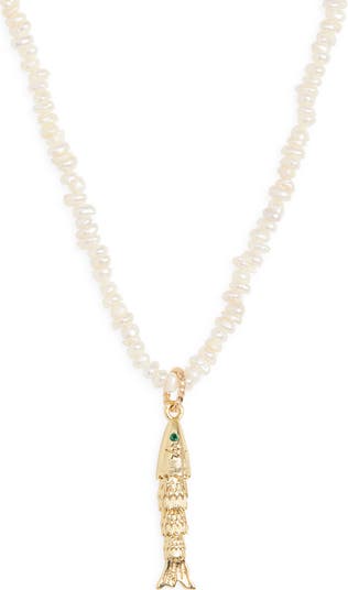 Lustrous freshwater pearl beads and a fish pendant showcase the beauty of the sea on this unique Piscean necklace.