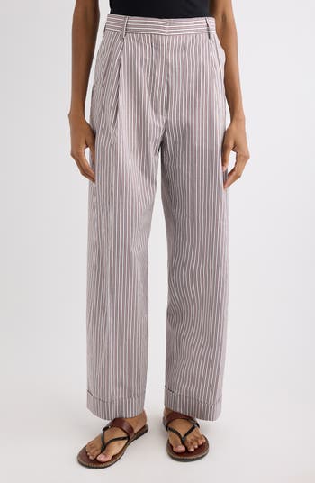 The Belgian house redefines sartorial drama with these wide-leg pleated pants cut from a washed cotton-and-silk blend and detailed with perfectly aligned stripes that speak to the architecturally precise tailoring.