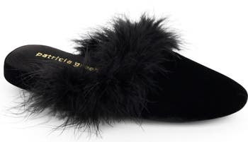 Crafted from rich velvet with feather trim, this luxe slipper boasts a playful fusion of cozy and glamorous.