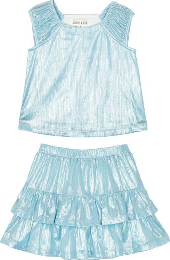 This girls' two-piece set in shimmering sky blue metallic fabric features a sleeveless top with delicate ruffle-trimmed shoulders for a stylish touch. The matching tiered ruffle skirt adds movement and flair, creating a fun and trendy look. Lightweight and comfortable, this set is perfect for making a bold fashion statement. Fabric Care 100% POLYESTER Machine Wash Cold | Line Dry Do Not Bleach