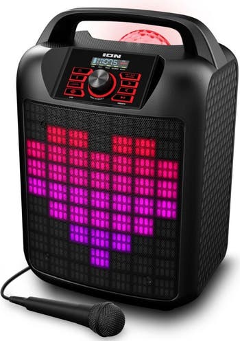 Ion iPA137 PARTY ROCKER MAX MK2 - Portable Bluetooth Tailgate Speaker - FM - 120W (Black) HIGH-POWER PORTABLE BLUETOOTH®?-ENABLED SPEAKER WITH 18 CUSTOMIZABLE PARTY THEME LIGHTS! Energize your party with customizable party theme lights and dynamic sound that takes the party with you wherever you go. The Party Rocker™? Max has everything you need to transform any get-together into a special occasion. With its powerful 120-watt dynamic amplifier, the sound is rich and vibrant. The Party Rocker™? Max takes your event to the next level by allowing you to customize each of your parties with 18 different preset holiday and classic party themes with our Party Theme Customizable Light Show feature. The lights can also change pattern and beat-sync in time to the music. You can stream music wirelessly from any B A high-quality microphone with Echo Effect and cable are included so your Karaoke competitions sound like big-budget productions! For ultimate convenience, the optical input allows you to stream Karaoke videos from your smart TV through the Party Rocker™ Max so you have a real Karaoke experience. With back-lit buttons so you can easily see in the dark, and a Boom Button™? to instantly crank up the bass, volume, and light effects you will always be ready for any event. Product Features BLUETOOTH 5.0 ENABLED Stream and control your music wirelessly ION SOUND XP™? APP Controls audio and lighting HIGH-POWER 120-WATT SOUND SYSTEM 8” woofer and 3” tweeter delivers lifelike sound PARTY THEME CUSTOMIZABLE LIGHT SHOW Choose from 18 preset holiday and classic party themes RECHARGEABLE 15-HOUR BATTERY Delivers long lasting fun FM RADIO WITH PRESETS Plays all your favorite stations BOOM BUTTON™? Instantly cranks up the bass, volume, and light effects OPTICAL INPUT JACK Connect to TV and amplify audio for instant big-screen Karaoke BACK-LIT BUTTONS For easy operation