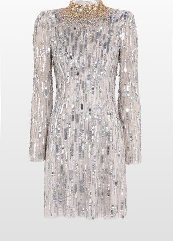 A showstopping party dress designed to dazzle, this piece features a high neckline embellished with clusters. The body is covered in shimmering sequins and paillettes, catching the light with every movement. Long sleeves and a refined silhouette complete the look, making it a striking choice for festive celebrations and evening events.