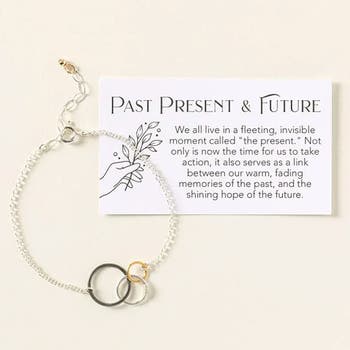- Three interlocking circles: a muted, oxidized ring represents the past; a sterling silver ring wrapped with a band of silver wire captures the present; and a shimmering, gold filled ring represents the future