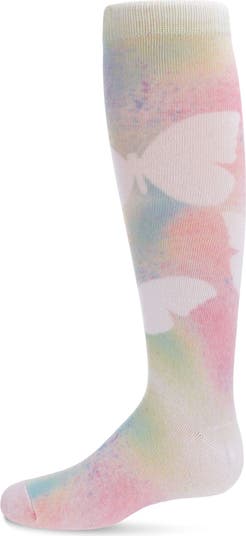 These whimsical socks are what daydreams are made of. Knee high pastel tie dye socks are offset by white printed butterflies, seemingly painted on to further make these socks a work of art. Soft fabric makes these easy for her to wear with her favorite outfits, all day long. Dream on, kid.