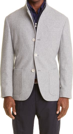 A polished Mandarin collar and roomy patch pockets distinguish a slim-fit jacket tailored in soft cashmere.