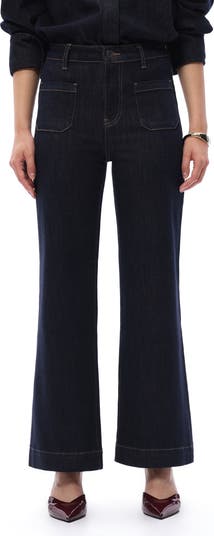 Slightly shorter than typical wide-leg jeans, this stretch-denim pair features a high waist and patch pockets for a charming vintage vibe.