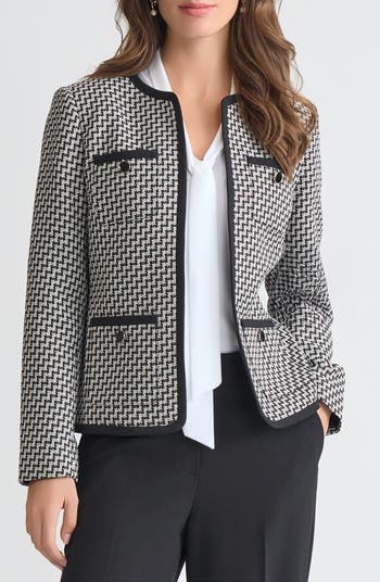 Solid trim and gleaming buttons enhance the heritage-inspired style of this softly structured tweed jacket fashioned in an open-front silhouette.
