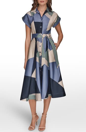 This stretch-cotton shirtdress gets the job done—and done well—in a swingy, belted silhouette featuring rolled-cuff dolman sleeves and an abstract patchwork.