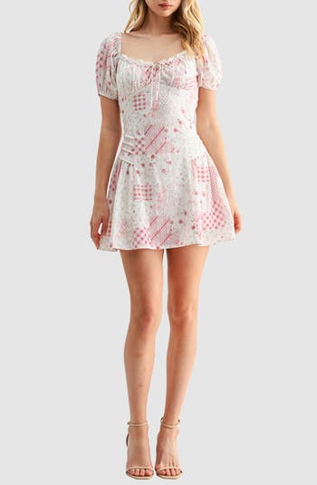 Pretty patches sweeten a darling minidress fixed with puff sleeves and dappled in dainty embroidered details.