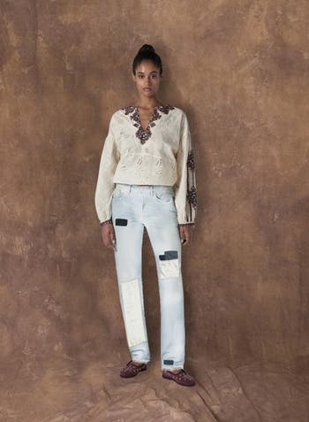 Timeless style with Fortela's Women's 965 John Regular Fit Custom Wash Patchwork Denim Jeans. Crafted in Italy from premium denim, these 5-pocket jeans feature a flattering medium-rise and a unique patchwork design. The regular fit ensures all-day comfort, while the vintage denim and custom wash add a touch of character. Details include Fortela branded buttons, rivets, and a leather patch. The jeans are finished with a distinctive 'snail' hem, showcasing Fortela's commitment to quality and craftsmanship.