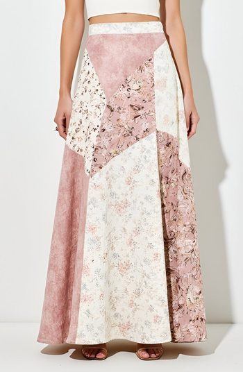 This maxi skirt features a beautifully blended patchwork design of delicate florals in muted blush and ivory tones. Chevron-panel construction elongates the silhouette and brings a subtle vintage charm. The full-length cut and softly flared hem create graceful movement with every step. An effortless piece that pairs perfectly with tucked blouses or simple tanks for a modern, romantic look.