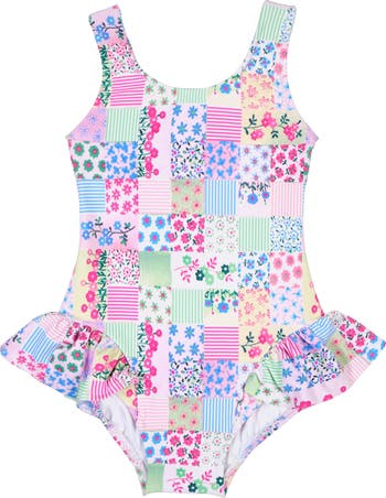 Bright and full of charm, this swimsuit features a multicolor floral patchwork print on soft, stretchy swim fabric for all-day comfort. Playful hip ruffles add movement and flair, while a back tie allows for an adjustable, just-right fit. Shirred back legs help keep the suit comfortably in place during swimming and play, and sizes 12M–24M include inseam snaps for easy changes. Perfect for beach days, poolside fun, and warm-weather getaways.