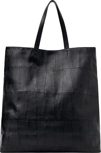 Patchwork panels of buttery-soft leather create visual intrigue against a minimalist shopper bag designed to stand out against any outfit.