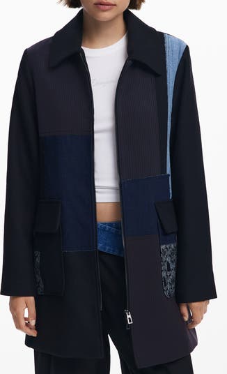 Patchworked pieces add interest and visual texture to this zip-front coat made with a generous dose of wool for warmth.