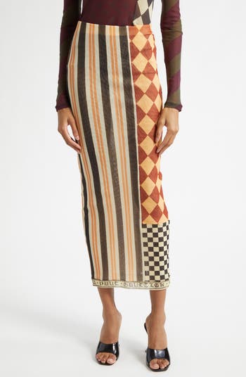 Patterned in a hypnotic collage of retro motifs, this curve-contouring maxi skirt pays homage to the iconoclastic designer's coveted mesh styles that first garnered fans in the '90s.