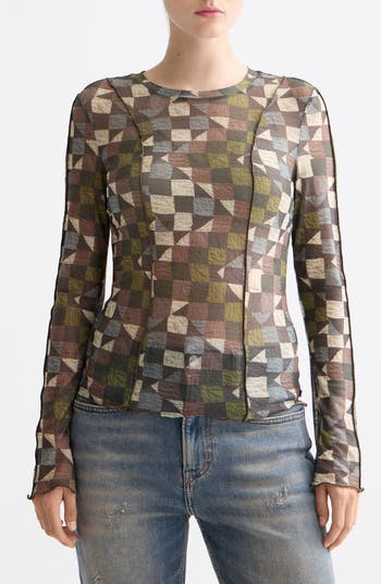 Raised princess seaming shapes a trim and stretchy top done up in a charming homespun patchwork print.